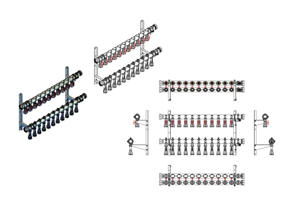 Kugelhähne mit Klemmverschraubung 32 mm im Vorlaufbalken, Durchlussanzeiger 4-15 l/min, integrierte Regulierventile und Klemmverchraubungen 32 mm im Rücklaufbalken, Spül-, Füll- und Entleerventil im Vor- und Rücklaufbalken, Doppelwandhalter 300mm
