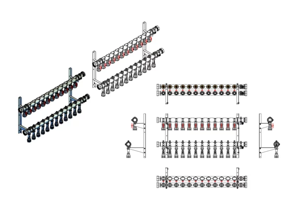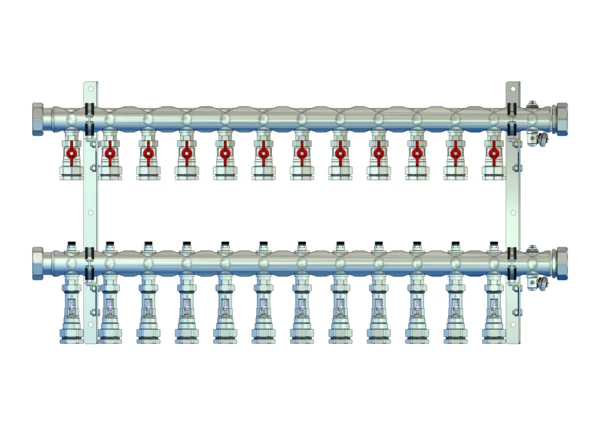 Kugelhähne mit Klemmverschraubung 32 mm im Vorlaufbalken, Durchlussanzeiger 4-15 l/min, integrierte Regulierventile und Klemmverchraubungen 32 mm im Rücklaufbalken, Spül-, Füll- und Entleerventil im Vor- und Rücklaufbalken, Doppelwandhalter 300mm
