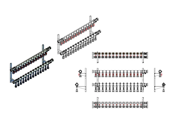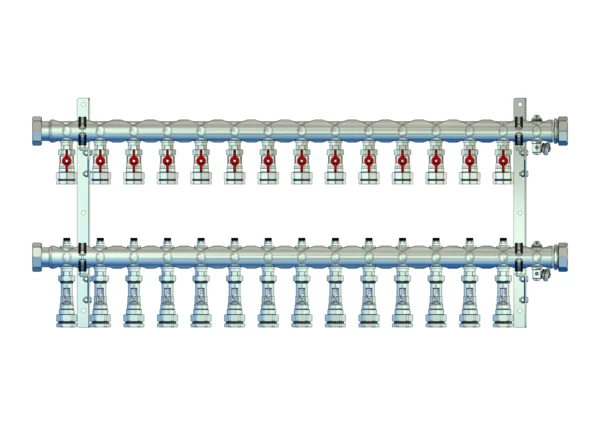 Kugelhähne mit Klemmverschraubung 32 mm im Vorlaufbalken, Durchlussanzeiger 4-15 l/min, integrierte Regulierventile und Klemmverchraubungen 32 mm im Rücklaufbalken, Spül-, Füll- und Entleerventil im Vor- und Rücklaufbalken, Doppelwandhalter 300mm