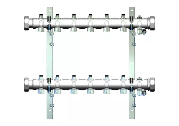 Der Anschlussverteiler für Flächenheizung, -kühlung und Soleanwendungen gewährleistet einen präzisen hydraulischen Abgleich der Heizkreise durch integrierte manuell einstellbare und absperrbare Regulierventile pro Heizkreis.