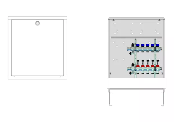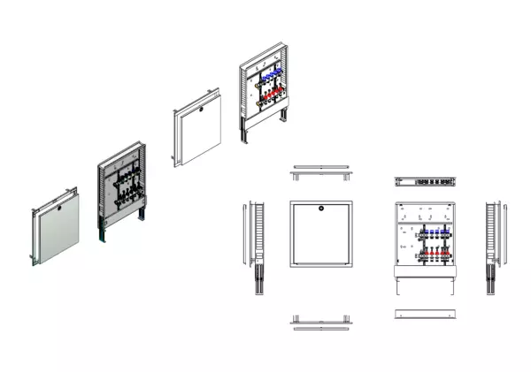 Modulare Anschlussstation für Flächenheizung und -kühlung, im Unterputzschrank montierter Edelstahlverteiler mit regulierbaren Durchflussanzeigern und Ventileinsätzen (M30x1,5), horizontale Anschlussgarnitur ohne Wärmezählerverrohrung, Platzhaltung für Anschlussgarnituren mit oder ohne Wärmezählerverrohrung, Wasserzählereinbaustrecken, Klemmleiste und Stellantriebe.