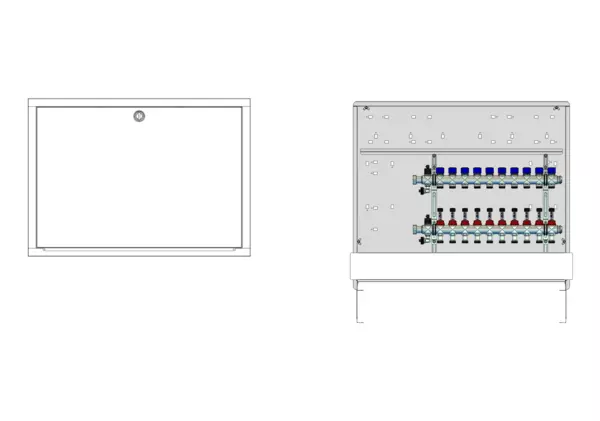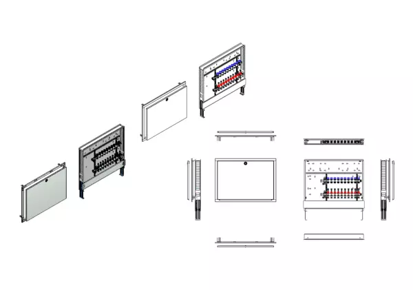 Modulare Anschlussstation für Flächenheizung und -kühlung, im Unterputzschrank montierter Edelstahlverteiler mit regulierbaren Durchflussanzeigern und Ventileinsätzen (M30x1,5), horizontale Anschlussgarnitur ohne Wärmezählerverrohrung, Platzhaltung für Anschlussgarnituren mit oder ohne Wärmezählerverrohrung, Wasserzählereinbaustrecken, Klemmleiste und Stellantriebe.