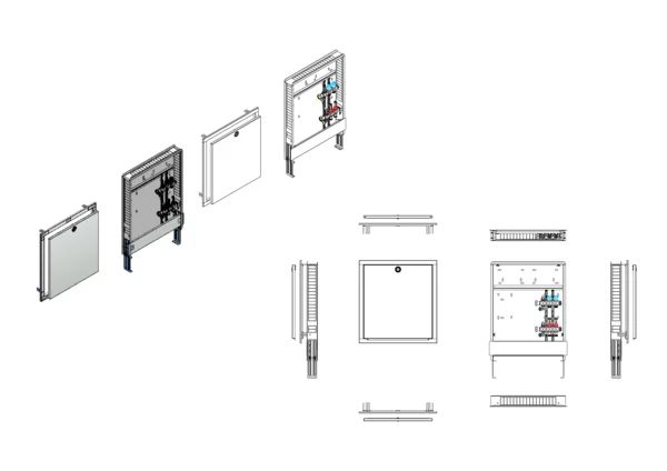 Modulare Anschlussstation für Flächenheizung und -kühlung, im Unterputzschrank montierter Edelstahlverteiler mit absperrbarem Durchflussanzeigern und Ventileinsätzen für EGO-Schnellverschluss, Platzhaltung für Anschlussgarnituren mit oder ohne Wärmezählerverrohrung, Wasserzählereinbaustrecken, Klemmleiste und EGO-Regelantrieben.