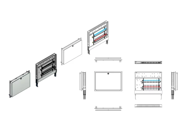 Modulare Anschlussstation für Flächenheizung und -kühlung, im Unterputzschrank montierter Edelstahlverteiler mit absperrbarem Durchflussanzeigern und Ventileinsätzen für EGO-Schnellverschluss, Platzhaltung für Anschlussgarnituren mit oder ohne Wärmezählerverrohrung, Wasserzählereinbaustrecken, Klemmleiste und EGO-Regelantrieben.
