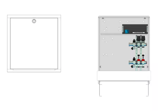 strawa Comfort Anschlussstation FBH-63-X-C80-E 2 Hkr.,BxHxT: 600 x 775 x 92 mm, ohne Anschlussgarnitur, Verteiler mit DFA 0-3 l/min + THV M30x1,5, mit vorm. Stellantrieben und Klemmleiste mit Vorverdrahtung, Comfort-UP-Schrank mit Frontblende in RAL 9016