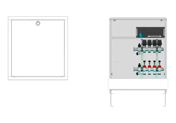strawa Comfort Anschlussstation FBH-63-X-C80-E 4 Hkr.,BxHxT: 600 x 775 x 92 mm, ohne Anschlussgarnitur, Verteiler mit DFA 0-3 l/min + THV M30x1,5, mit vorm. Stellantrieben und Klemmleiste mit Vorverdrahtung, Comfort-UP-Schrank mit Frontblende in RAL 9016