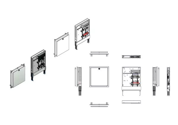 Modulare Anschlussstation für Flächenheizung, im Unterputzschrank montierter Edelstahlverteiler mit regulierbaren Durchflussanzeigern und Ventileinsätzen (M30x1,5), vormontierte und verdrahtete Stellantriebe auf montierter Klemmleiste, Platzhaltung für Anschlussgarnituren mit oder ohne Wärmezählerverrohrung und Wasserzählereinbaustrecken.
