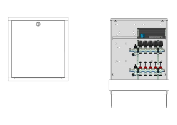 strawa Comfort Anschlussstation FBH-63-X-C80-E 5 Hkr.,BxHxT: 600 x 775 x 92 mm, ohne Anschlussgarnitur, Verteiler mit DFA 0-3 l/min + THV M30x1,5, mit vorm. Stellantrieben und Klemmleiste mit Vorverdrahtung, Comfort-UP-Schrank mit Frontblende in RAL 9016