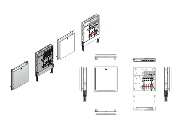 Modulare Anschlussstation für Flächenheizung, im Unterputzschrank montierter Edelstahlverteiler mit regulierbaren Durchflussanzeigern und Ventileinsätzen (M30x1,5), vormontierte und verdrahtete Stellantriebe auf montierter Klemmleiste, Platzhaltung für Anschlussgarnituren mit oder ohne Wärmezählerverrohrung und Wasserzählereinbaustrecken.