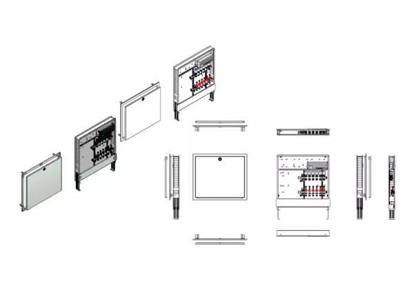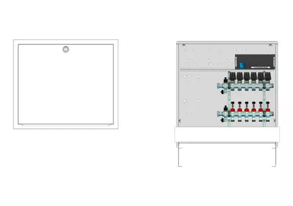 Modulare Anschlussstation für Flächenheizung, im Unterputzschrank montierter Edelstahlverteiler mit regulierbaren Durchflussanzeigern und Ventileinsätzen (M30x1,5), vormontierte und verdrahtete Stellantriebe auf montierter Klemmleiste, Platzhaltung für Anschlussgarnituren mit oder ohne Wärmezählerverrohrung und Wasserzählereinbaustrecken.