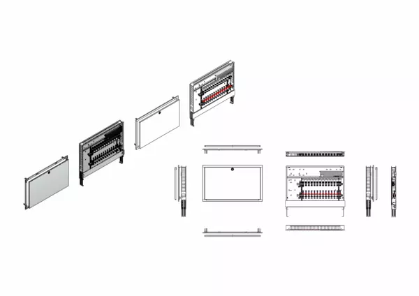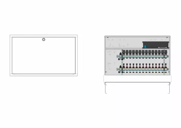 strawa Comfort Anschlussstation FBH-63-X-C80-E 14 Hkr.,BxHxT: 1050x775x92 mm, ohne Anschlussgarnitur, Verteiler mit DFA 0-3 l/min + THV M30x1,5 mit vorm. Stellantrieben und Klemmleiste mit Vorverdrahtung, Comfort-UP-Schrank mit Frontblende in RAL 9016