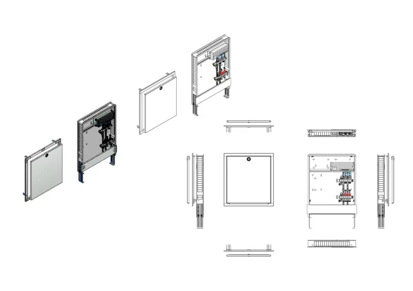 Modulare Anschlussstation für Flächenheizung, im Unterputzschrank montierter Edelstahlverteiler mit absperrbarem Durchflussanzeigern und Ventileinsätzen für EGO-Schnellverschluss, vormontierte und vorverdrahtete EGO-Regelantriebe auf vormontierter Klemmleiste, Platzhaltung für Anschlussgarnituren mit oder ohne Wärmezählerverrohrung und Wasserzählereinbaustrecken.