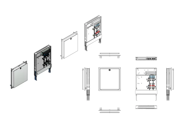 Modulare Anschlussstation für Flächenheizung, im Unterputzschrank montierter Edelstahlverteiler mit absperrbarem Durchflussanzeigern und Ventileinsätzen für EGO-Schnellverschluss, vormontierte und vorverdrahtete EGO-Regelantriebe auf vormontierter Klemmleiste, Platzhaltung für Anschlussgarnituren mit oder ohne Wärmezählerverrohrung und Wasserzählereinbaustrecken.