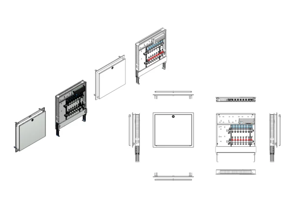 Modulare Anschlussstation für Flächenheizung, im Unterputzschrank montierter Edelstahlverteiler mit absperrbarem Durchflussanzeigern und Ventileinsätzen für EGO-Schnellverschluss, vormontierte und vorverdrahtete EGO-Regelantriebe auf vormontierter Klemmleiste, Platzhaltung für Anschlussgarnituren mit oder ohne Wärmezählerverrohrung und Wasserzählereinbaustrecken.