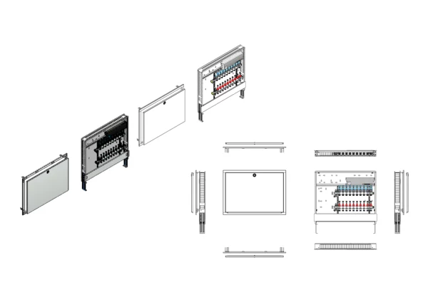Modulare Anschlussstation für Flächenheizung, im Unterputzschrank montierter Edelstahlverteiler mit absperrbarem Durchflussanzeigern und Ventileinsätzen für EGO-Schnellverschluss, vormontierte und vorverdrahtete EGO-Regelantriebe auf vormontierter Klemmleiste, Platzhaltung für Anschlussgarnituren mit oder ohne Wärmezählerverrohrung und Wasserzählereinbaustrecken.