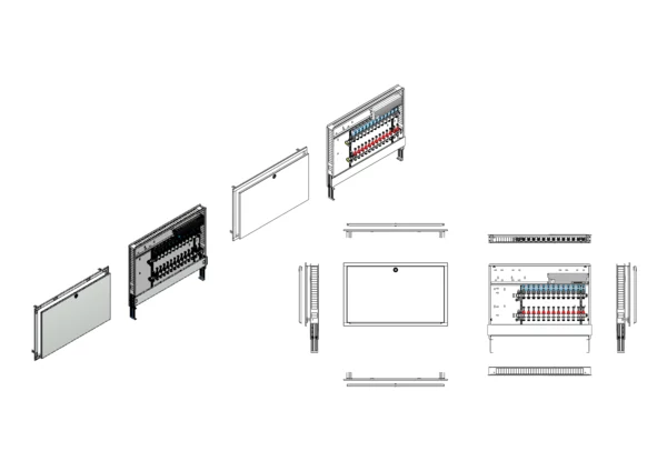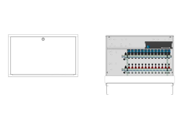 Modulare Anschlussstation für Flächenheizung, im Unterputzschrank montierter Edelstahlverteiler mit absperrbarem Durchflussanzeigern und Ventileinsätzen für EGO-Schnellverschluss, vormontierte und vorverdrahtete EGO-Regelantriebe auf vormontierter Klemmleiste, Platzhaltung für Anschlussgarnituren mit oder ohne Wärmezählerverrohrung und Wasserzählereinbaustrecken.