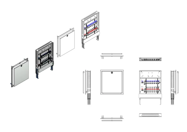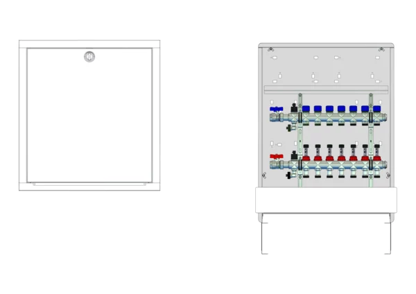 Anschlussstation für Flächenheizung und -kühlung, im Unterputzschrank montierter Edelstahlverteiler mit regulierbaren Durchflussanzeigern und Ventileinsätzen (M30x1,5), horizontale Anschlussgarnitur ohne Wärmezählerverrohrung. Platzhaltung für Klemmleiste und Stellantriebe.
