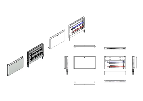 Anschlussstation für Flächenheizung und -kühlung, im Unterputzschrank montierter Edelstahlverteiler mit regulierbaren Durchflussanzeigern und Ventileinsätzen (M30x1,5), horizontale Anschlussgarnitur ohne Wärmezählerverrohrung. Platzhaltung für Klemmleiste und Stellantriebe.