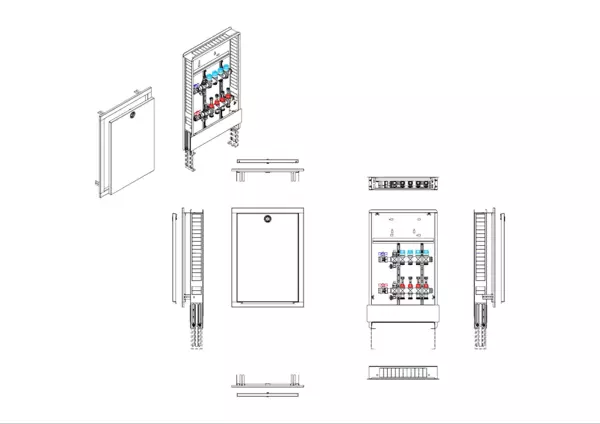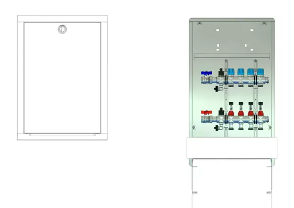 Anschlussstation für Flächenheizung und -kühlung, im Unterputzschrank montierter Edelstahlverteiler mit absperrbarem Durchflussanzeigern und Ventileinsätzen für EGO-Schnellverschluss, horizontale Anschlussgarnitur ohne Wärmezählerverrohrung. Platzhaltung für Klemmleiste und EGO-Regelantriebe.