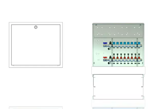 Anschlussstation für Flächenheizung und -kühlung, im Unterputzschrank montierter Edelstahlverteiler mit absperrbarem Durchflussanzeigern und Ventileinsätzen für EGO-Schnellverschluss, horizontale Anschlussgarnitur ohne Wärmezählerverrohrung. Platzhaltung für Klemmleiste und EGO-Regelantriebe.