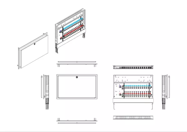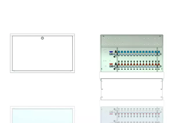Anschlussstation für Flächenheizung und -kühlung, im Unterputzschrank montierter Edelstahlverteiler mit absperrbarem Durchflussanzeigern und Ventileinsätzen für EGO-Schnellverschluss, horizontale Anschlussgarnitur ohne Wärmezählerverrohrung. Platzhaltung für Klemmleiste und EGO-Regelantriebe.