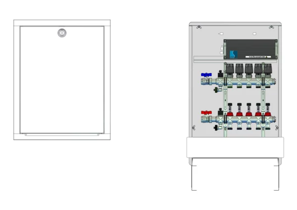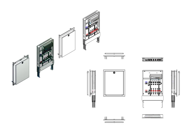 Anschlussstation für Flächenheizung, im Unterputzschrank montierter Edelstahlverteiler mit regulierbaren Durchflussanzeigern und Ventileinsätzen (M30x1,5), horizontale Anschlussgarnitur ohne Wärmezählerverrohrung, vormontierte und verdrahtete Stellantriebe auf montierter Klemmleiste.