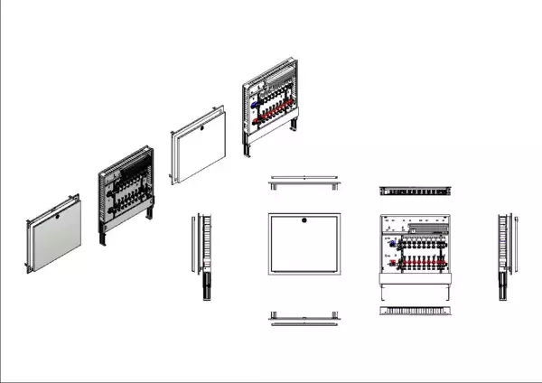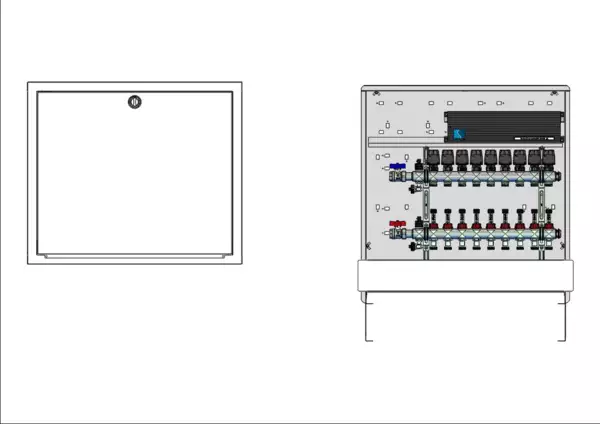Anschlussstation für Flächenheizung, im Unterputzschrank montierter Edelstahlverteiler mit regulierbaren Durchflussanzeigern und Ventileinsätzen (M30x1,5), horizontale Anschlussgarnitur ohne Wärmezählerverrohrung, vormontierte und verdrahtete Stellantriebe auf montierter Klemmleiste.