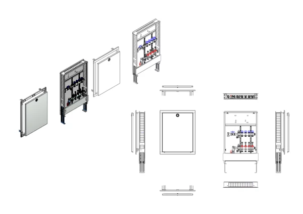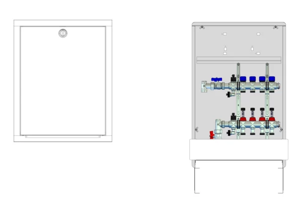 Anschlussstation für Flächenheizung und -kühlung, im Unterputzschrank montierter Edelstahlverteiler mit regulierbaren Durchflussanzeigern und Ventileinsätzen (M30x1,5), vertikale Anschlussgarnitur ohne Wärmezählerverrohrung, Platzhaltung für Klemmleiste und Stellantriebe.