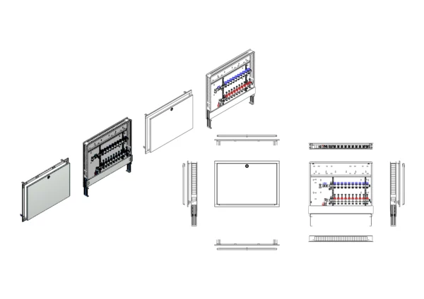 Anschlussstation für Flächenheizung und -kühlung, im Unterputzschrank montierter Edelstahlverteiler mit regulierbaren Durchflussanzeigern und Ventileinsätzen (M30x1,5), vertikale Anschlussgarnitur ohne Wärmezählerverrohrung, Platzhaltung für Klemmleiste und Stellantriebe.