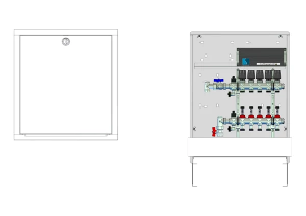 strawa Comfort Anschlussstation FBH-63-V-C80-E 5 Hkr.,BxHxT: 600 x 775 x 92 mm, vert. AG. o. WMZ, Verteiler mit DFA 0-3 l/min + THV M30x1,5, mit vorm. Stellantrieben und Klemmleiste mit Vorverdrahtung, Comfort-UP-Schrank mit Frontblende in RAL 9016