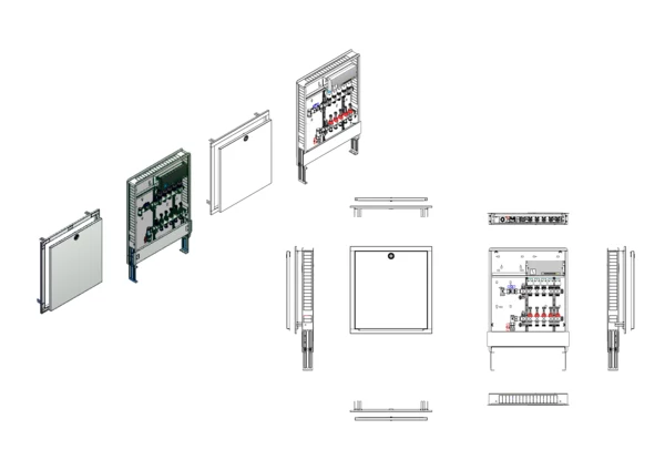 Anschlussstation für Flächenheizung, im Unterputzschrank montierter Edelstahlverteiler mit regulierbaren Durchflussanzeigern und Ventileinsätzen (M30x1,5), vertikale Anschlussgarnitur ohne Wärmezählerverrohrung, vormontierte und verdrahtete Stellantriebe auf montierter Klemmleiste.