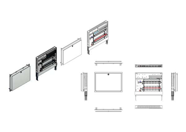 Anschlussstation für Flächenheizung, im Unterputzschrank montierter Edelstahlverteiler mit regulierbaren Durchflussanzeigern und Ventileinsätzen (M30x1,5), vertikale Anschlussgarnitur ohne Wärmezählerverrohrung, vormontierte und verdrahtete Stellantriebe auf montierter Klemmleiste.
