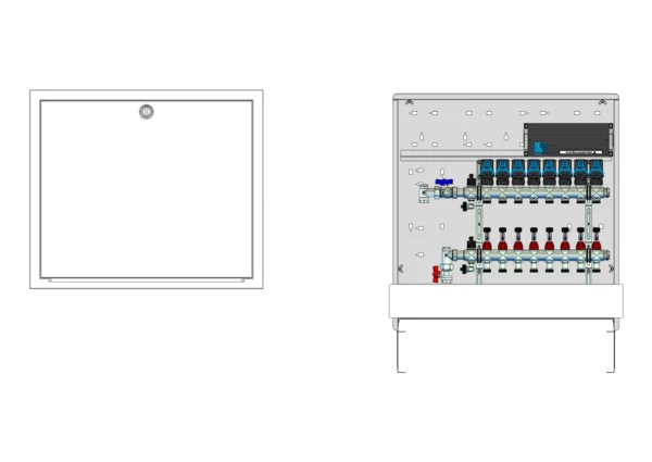 strawa Comfort Anschlussstation FBH-18-V-C80-EGO 8 Hkr.,BxHxT: 750x776x92 mm, vert. AG. o. WMZ, Verteiler mit DFA min/max + THV, mit vorm. EGO-Regelantrieben u. Klemmleiste mit Vorverdraht., Comfort-UP-Schrank mit Frontblende in RAL 9016