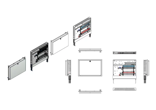 Anschlussstation für Flächenheizung, im Unterputzschrank montierter Edelstahlverteiler mit absperrbarem Durchflussanzeigern und Ventileinsätzen für EGO-Schnellverschluss, vertikale Anschlussgarnitur ohne Wärmezählerverrohrung, vormontierte und vorverdrahtete EGO-Regelantriebe auf vormontierter Klemmleiste.