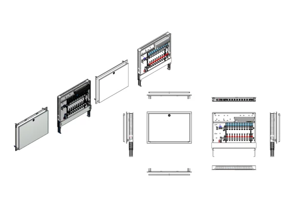 Anschlussstation für Flächenheizung, im Unterputz-Schrank montierter Edelstahlverteiler mit absperrbaren Durchflussanzeigern und Ventileinsätzen für EGO-Schnellverschluss, vertikale Anschlussgarnitur ohne Wärmezählerverrohrung, vormontierte und vorverdrahtete EGO-Regelantriebe auf vormontierter Klemmleiste.
