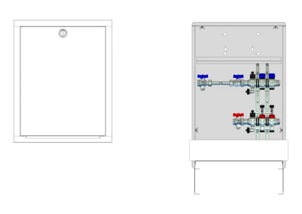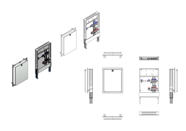 Anschlussstation für Flächenheizung und -kühlung, im Unterputzschrank montierter Edelstahlverteiler mit regulierbaren Durchflussanzeigern und Ventileinsätzen (M30x1,5), horizontale Anschlussgarnitur mit Wärmezählerverrohrung, Platzhaltung für Klemmleiste und Stellantriebe.