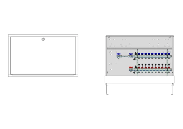Anschlussstation für Flächenheizung und -kühlung, im Unterputzschrank montierter Edelstahlverteiler mit regulierbaren Durchflussanzeigern und Ventileinsätzen (M30x1,5), horizontale Anschlussgarnitur mit Wärmezählerverrohrung, Platzhaltung für Klemmleiste und Stellantriebe.
