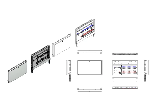 Anschlussstation für Flächenheizung und -kühlung, im Unterputzschrank montierter Edelstahlverteiler mit regulierbaren Durchflussanzeigern und Ventileinsätzen (M30x1,5), horizontale Anschlussgarnitur mit Wärmezählerverrohrung, Platzhaltung für Klemmleiste und Stellantriebe.