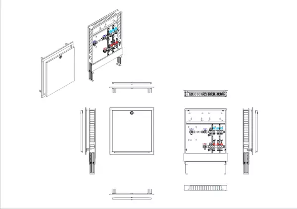 Anschlussstation für Flächenheizung und -kühlung, im Unterputzschrank montierter Edelstahlverteiler mit absperrbarem Durchflussanzeigern und Ventileinsätzen für EGO-Schnellverschluss, horizontale Anschlussgarnitur mit Wärmezählerverrohrung, Platzhaltung für Klemmleiste und Regelantriebe.