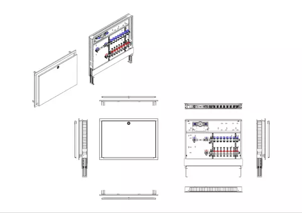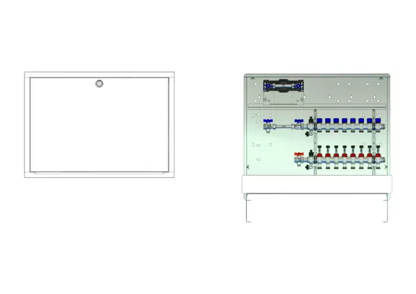 Anschlussstation für Flächenheizung und -kühlung , im Unterputzschrank montierter Edelstahlverteiler mit regulierbaren Durchflussanzeigern und Ventileinsätzen (M30x1,5), horizontale Anschlussgarnitur mit Wärmezählerverrohrung, Wasserzählereinbaustrecke für Trinkwasser kalt, Platzhaltung für Klemmleiste und Stellantriebe