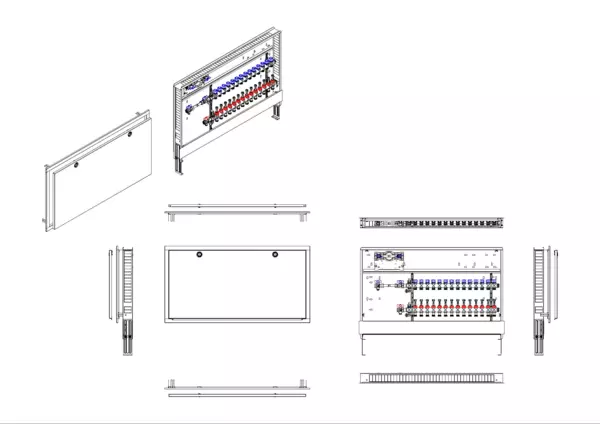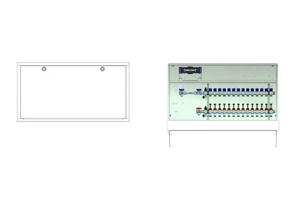 Anschlussstation für Flächenheizung und -kühlung , im Unterputzschrank montierter Edelstahlverteiler mit regulierbaren Durchflussanzeigern und Ventileinsätzen (M30x1,5), horizontale Anschlussgarnitur mit Wärmezählerverrohrung, Wasserzählereinbaustrecke für Trinkwasser kalt, Platzhaltung für Klemmleiste und Stellantriebe