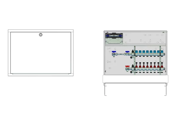 Anschlussstation für Flächenheizung und -kühlung, im Unterputz-Schrank montierter Edelstahlverteiler mit absperrbaren Durchflussanzeigern und Ventileinsätzen für EGO-Schnellverschluss, horizontale Anschlussgarnitur mit Wärmezählerverrohrung, Wasserzählereinbaustrecke für Trinkwasser kalt, Platzhaltung für Klemmleiste und EGO-Regelantriebe.
