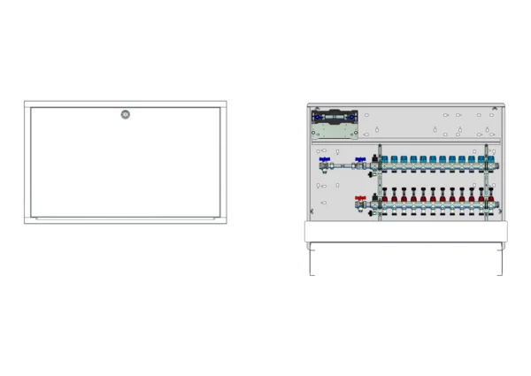 strawa Comfort Anschlussstation FBH-18-H-W1-WMZ-C80 12 Hkr.,BxHxT: 1048x775x92 mm, horiz. AG. m. WMZ, Verteiler mit DFA min/max + THV für EGO-Aufnahme, Wasserzählerstr. TW kalt, Comfort-UP-Schrank mit Frontblende in RAL 9016