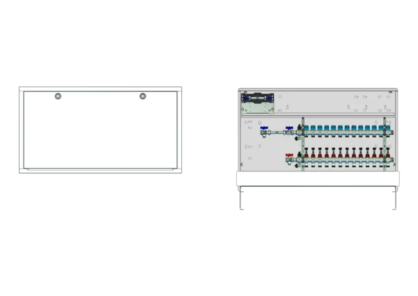 strawa Comfort Anschlussstation FBH-18-H-W1-WMZ-C80 13 Hkr.,BxHxT: 1198x775x92 mm, horiz. AG. m. WMZ, Verteiler mit DFA min/max + THV für EGO-Aufnahme, Wasserzählerstr. TW kalt, Comfort-UP-Schrank mit Frontblende in RAL 9016