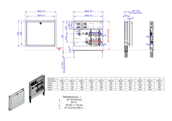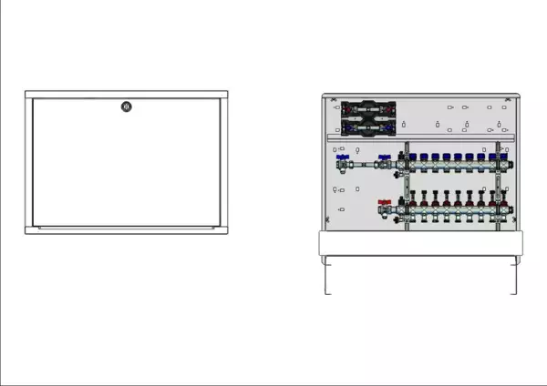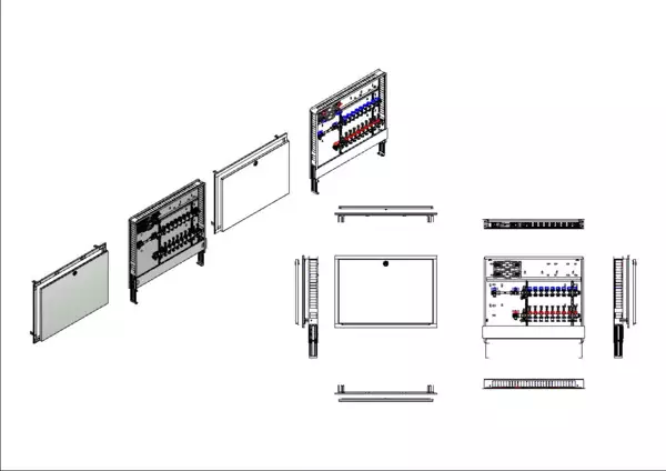 Anschlussstation für Flächenheizung und -kühlung, im Unterputzschrank montierter Edelstahlverteiler mit regulierbaren Durchflussanzeigern und Ventileinsätzen (M30x1,5), horizontale Anschlussgarnitur mit Wärmezählerverrohrung und Wasserzählereinbaustrecke für Trinkwasser kalt und warm, Platzhaltung für Klemmleiste und Stellantriebe.