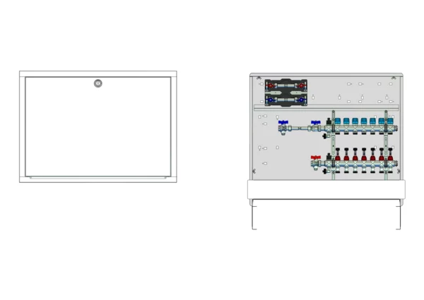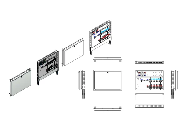 Anschlussstation für Flächenheizung und -kühlung , im Unterputzschrank montierter Edelstahlverteiler mit absperrbarem Durchflussanzeigern und Ventileinsätzen für EGO-Schnellverschluss, horizontale Anschlussgarnitur mit Wärmezählerverrohrung, Wasserzählereinbaustrecke für Trinkwasser kalt und warm, Platzhaltung für Klemmleiste und EGO-Regelantriebe.