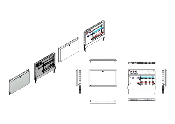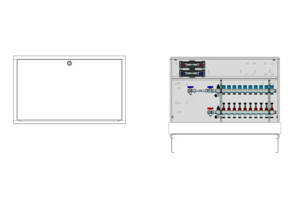Anschlussstation für Flächenheizung und -kühlung , im Unterputzschrank montierter Edelstahlverteiler mit absperrbarem Durchflussanzeigern und Ventileinsätzen für EGO-Schnellverschluss, horizontale Anschlussgarnitur mit Wärmezählerverrohrung, Wasserzählereinbaustrecke für Trinkwasser kalt und warm, Platzhaltung für Klemmleiste und EGO-Regelantriebe.