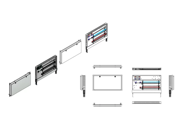 horizontale Anschlussgarnitur mit Wärmezählerverohrung, Verteiler mit Durchflussanzeiger min/max im Vorlaufbalken und Thermostatventileinsatz für EGO-Aufnahme im Rücklaufbalken, Wasserzählerstrecken Trinkwasser kalt und warm, Comfort-Unterputz-Schrank mit Frontblende in RAL 9016