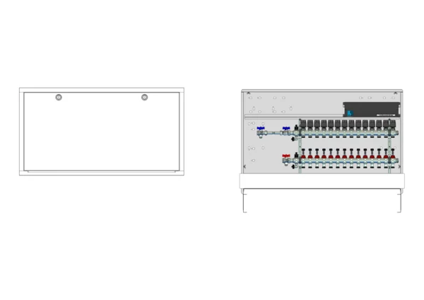 Anschlussstation für Flächenheizung, im Unterputzschrank montierter Edelstahlverteiler mit regulierbaren Durchflussanzeigern und Ventileinsätzen (M30x1,5), horizontale Anschlussgarnitur mit Wärmezählerverrohrung, vormontierte und verdrahtete Stellantriebe auf montierter Klemmleiste, Platzhaltung für Wasserzählereinbaustrecke.