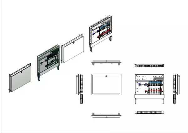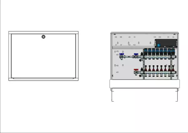 Anschlussstation für Flächenheizung, im Unterputz-Schrank montierter Edelstahlverteiler mit absperrbaren Durchflussanzeigern und Ventileinsätzen für EGO-Schnellverschluss, horizontale Anschlussgarnitur mit Wärmezählerverrohrung, vormontierte und vorverdrahtete EGO-Regelantriebe auf vormontierter Klemmleiste, Platzhaltung für Wasserzählereinbaustrecke.
